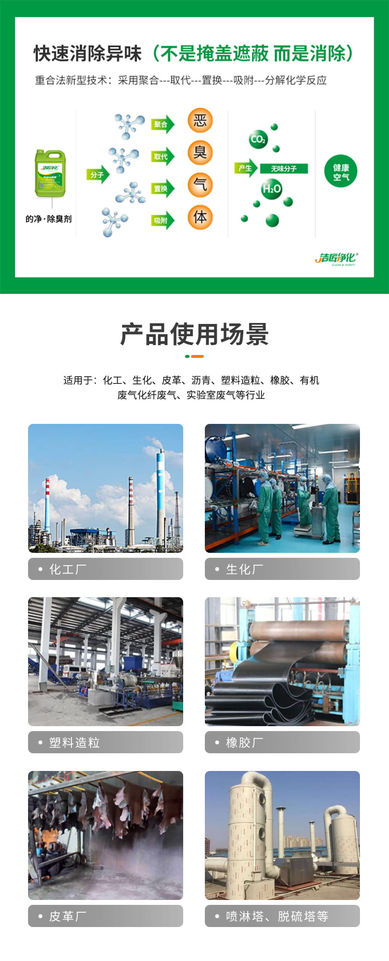 工業(yè)發(fā)展迅速,化工廠也在不斷發(fā)展,化工廠在生產(chǎn)過程中會(huì)產(chǎn)生大量的廢氣,比如氨、硫化氫、二氧化硫、甲硫氫、甲硫醇、甲硫醚、二甲二硫、二硫化碳和硫化氫等無機(jī)廢氣,還有VOC類:苯、甲苯、二甲苯、丙烯酸、醚類、脂類、醇類、酮類及苯乙烯等有機(jī)廢氣。不論有機(jī)廢氣還是無機(jī)廢氣,他們都有一個(gè)共同點(diǎn),散發(fā)著較大異味。化工廢氣除臭劑可以能與各種有害、異味分子迅速發(fā)生聚合、取代、置換、吸附等化學(xué)反應(yīng),針對(duì)各種廢氣進(jìn)行吸附,使原有污染氣體 異味分子結(jié)構(gòu)發(fā)生改變,讓空氣變得清新。